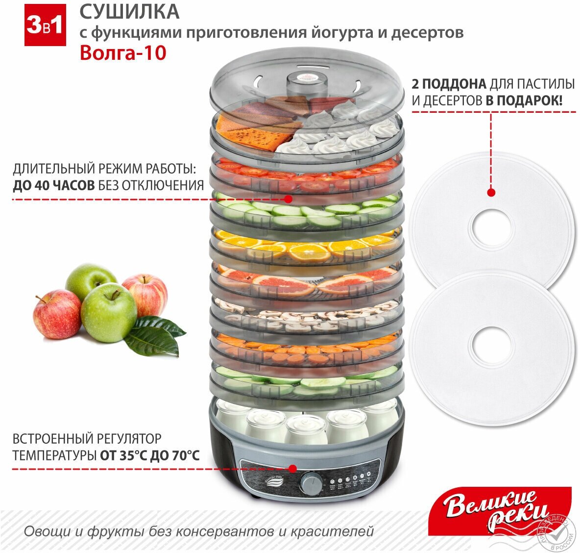 Сушилка для овощей 3в1 с функциями приготовления йогурта и десертов + 2 поддона для пастилы в подарок Великие Реки Волга-10 черно-серебристая