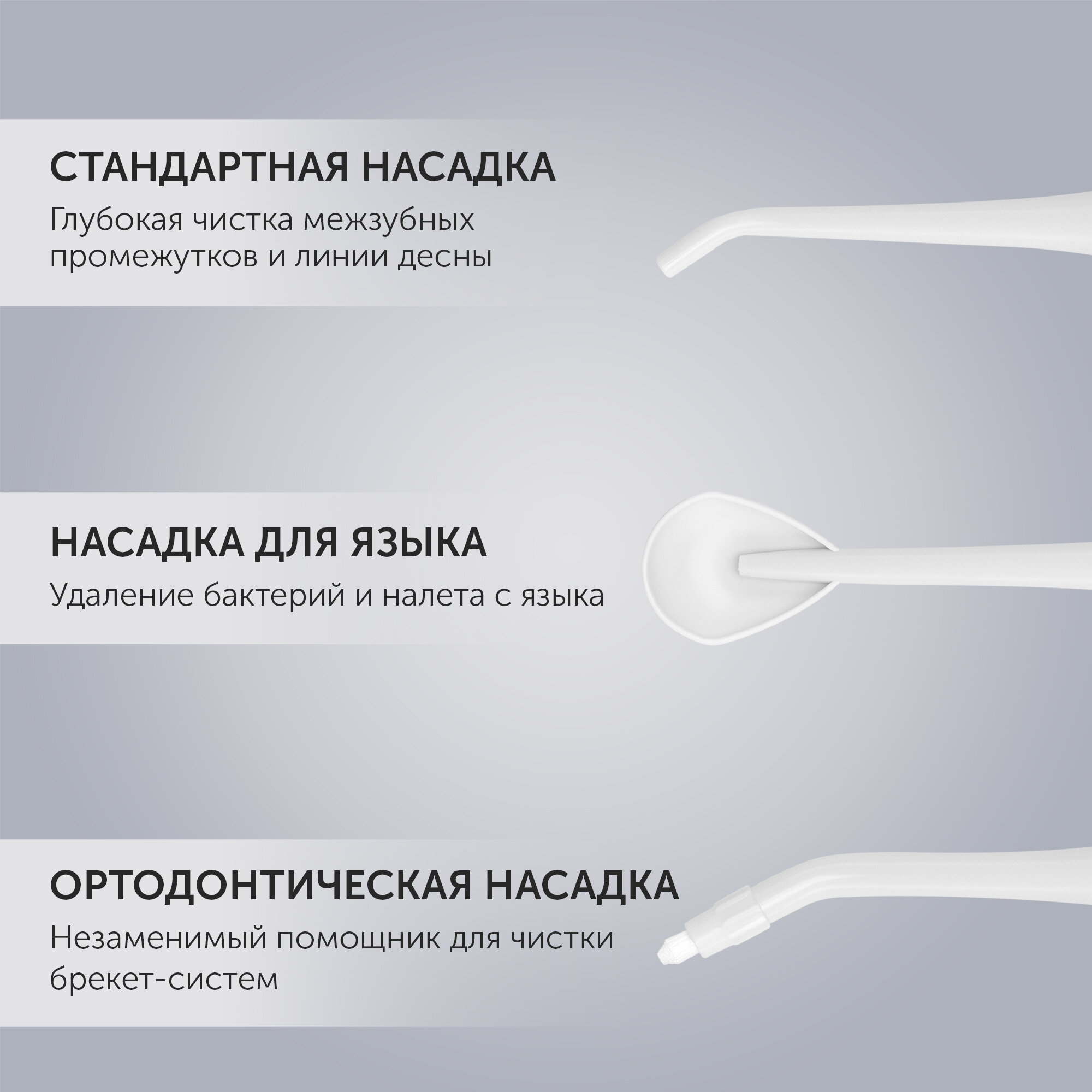 | Насадки | для струйной чистки / для чистки языка / ортодонтическая (для брекетов) |