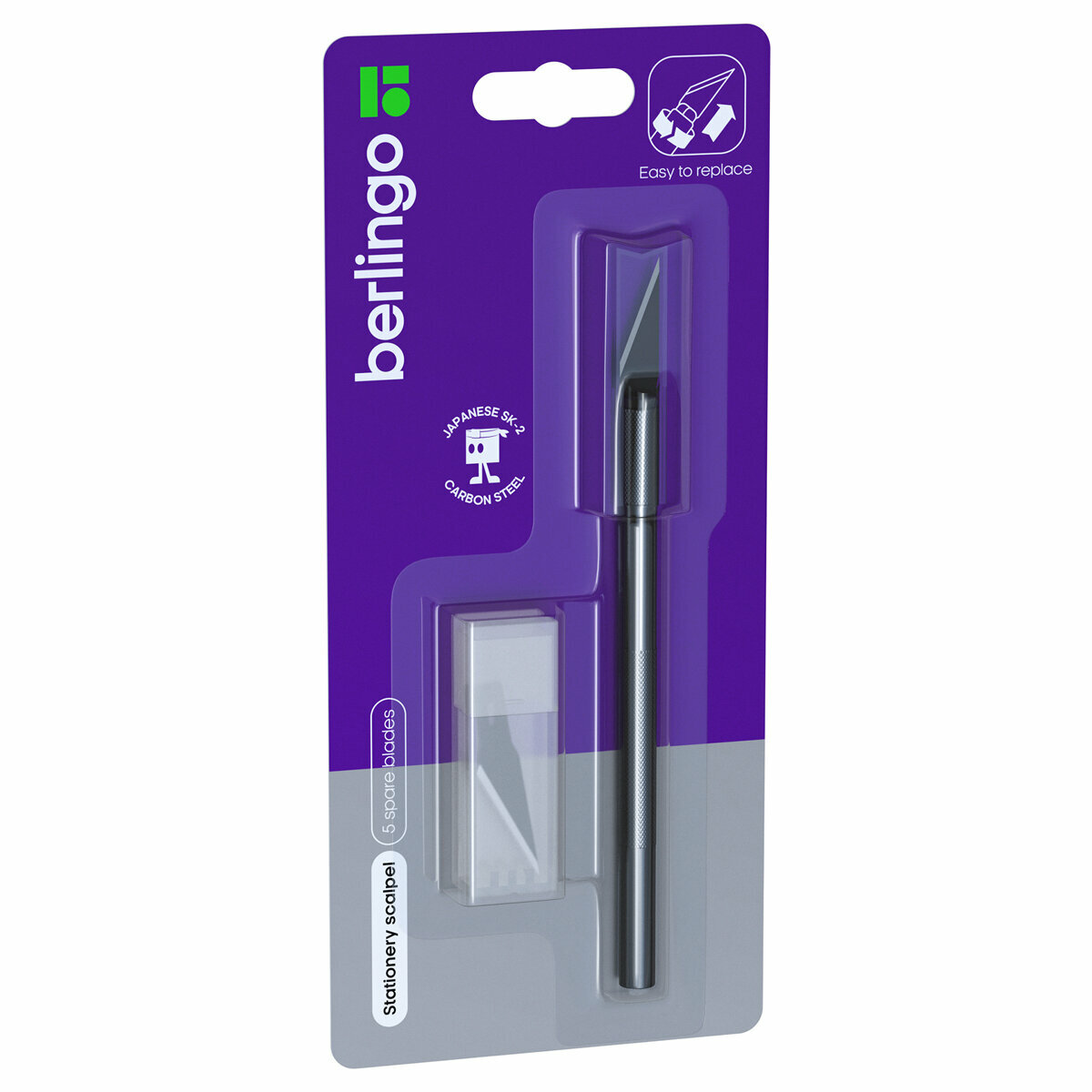 Нож-скальпель канцелярский Berlingo, металлический корпус черного цвета, 5 лезвий в комплекте