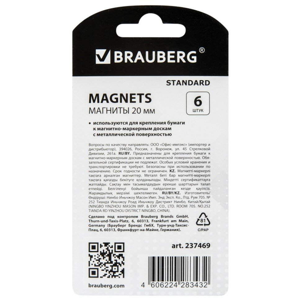 Магниты малого диаметра 20 мм, набор 6 шт., ассорти, BRAUBERG "STANDARD", 237469 . Комплект - 1 шт.