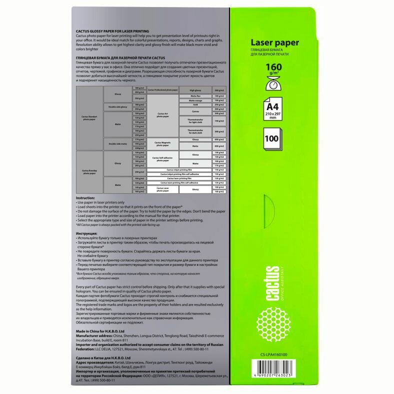 Ниже Вы можете прочитать отзывы на Фотобумага Cactus CS-LPA4160100 A4/160г/м2/100 л/белый, глянцевая, для лазерной печати, ознакомится с подробными характеристиками, посмотреть интересные обзоры и фотографии на Фотобумага Cactus CS-LPA4160100 A4/160г/м2/100 л/белый, глянцевая, для лазерной печати.