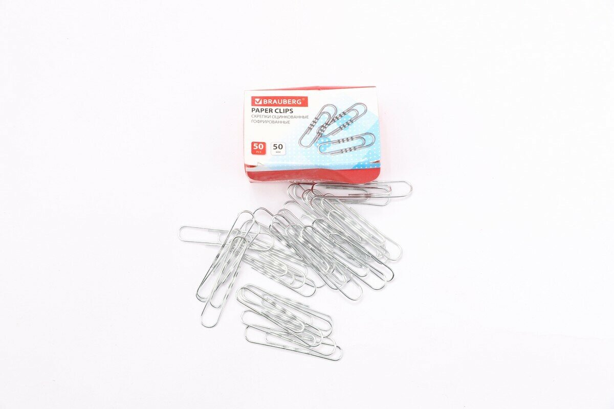 Скрепки большие 50 мм, BRAUBERG, оцинкованные, гофрированные, 50 шт, в картонной коробке, 270446
