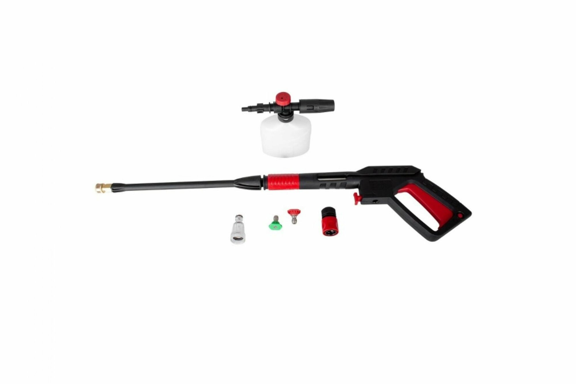 Транспортировочные колеса, длинный шланг, доступная стоимость, мощный напор, пеногенератор, сборка, небольшой вес и габариты