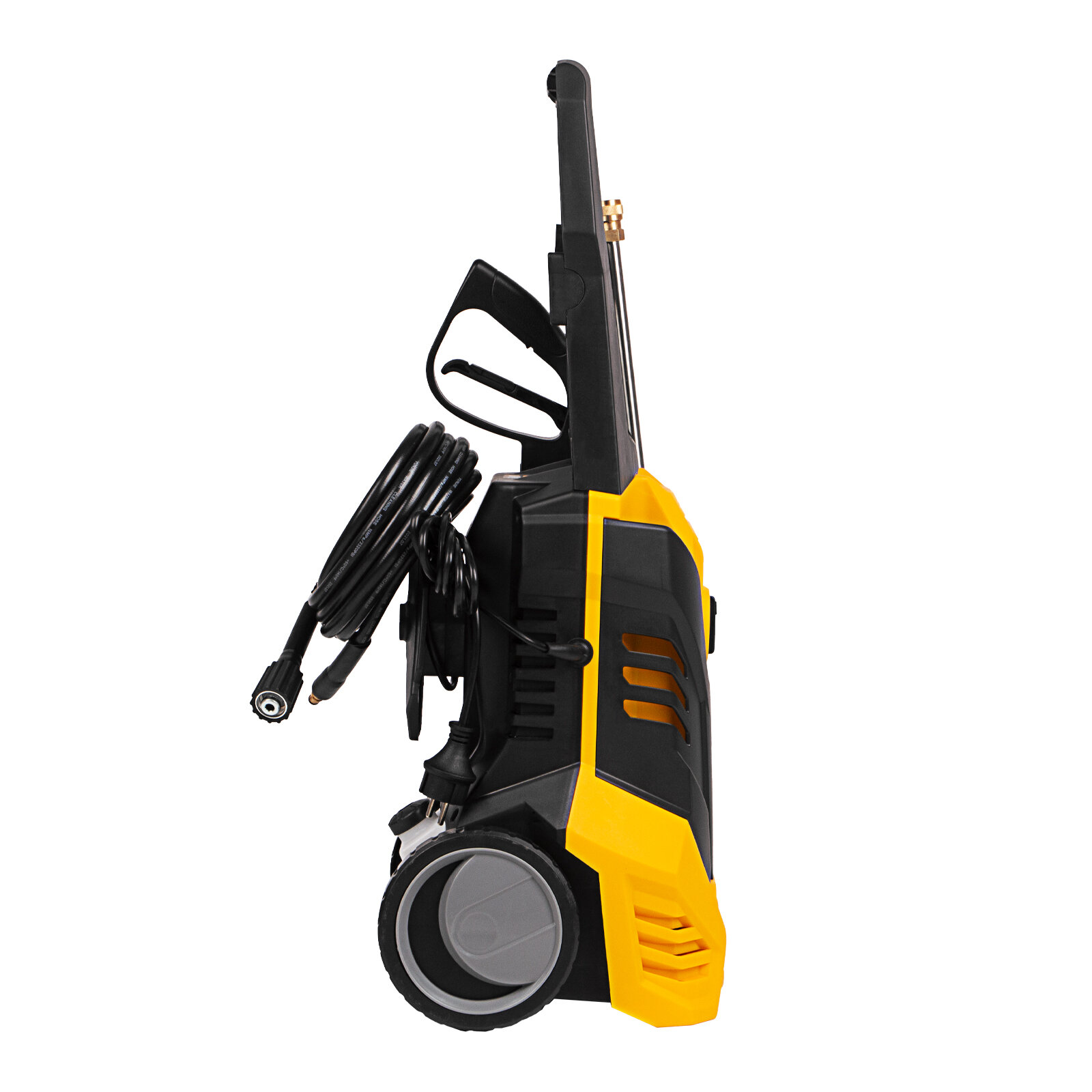 Хорошее давление. Удобная рукоятка пистолета и вращающийся в ней штуцер шланга высокого давления. Съемная штанга из металла. Легкость изменения горизонта струи поворотом сопла. Фильтр во входном съемном штуцере. Есть отсек для хранения штанги и место для намотки провода |