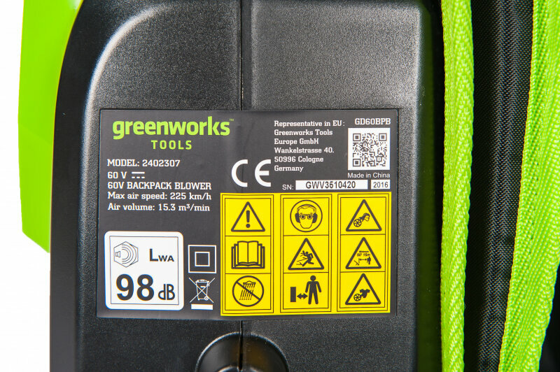 Воздуходувка садовая аккумуляторная Greenworks 2402307, 60В, ранцевая, без АКБ и ЗУ