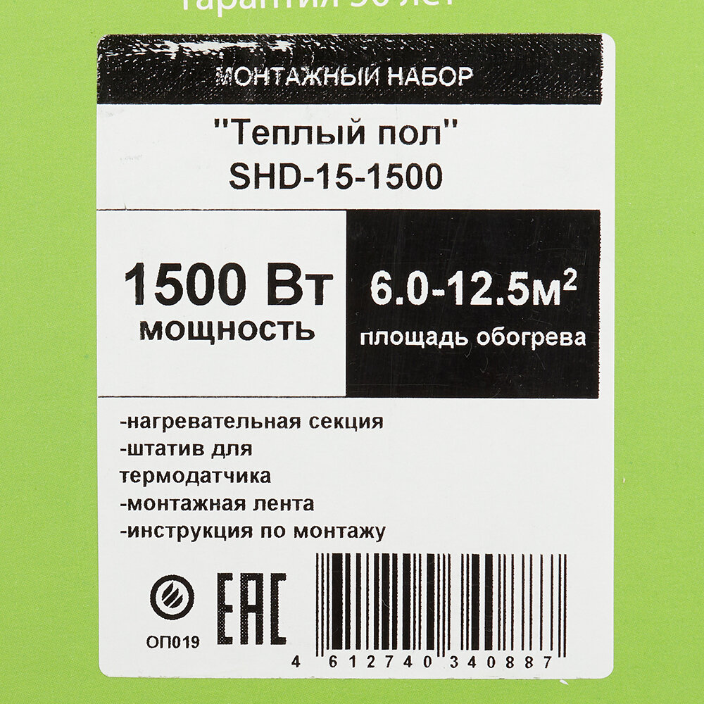Теплый пол SpyHeat SHD-15-1500, в стяжку, 9,4-12,5 м², 1500 Вт, 100 метров, двухжильный кабель.