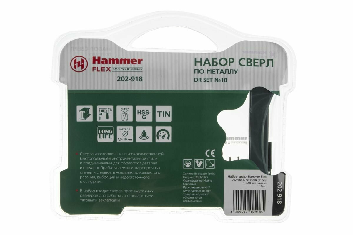 Набор сверл Hammer Flex 202-918 DR (62933) по металлу (15пред.) для шуруповертов