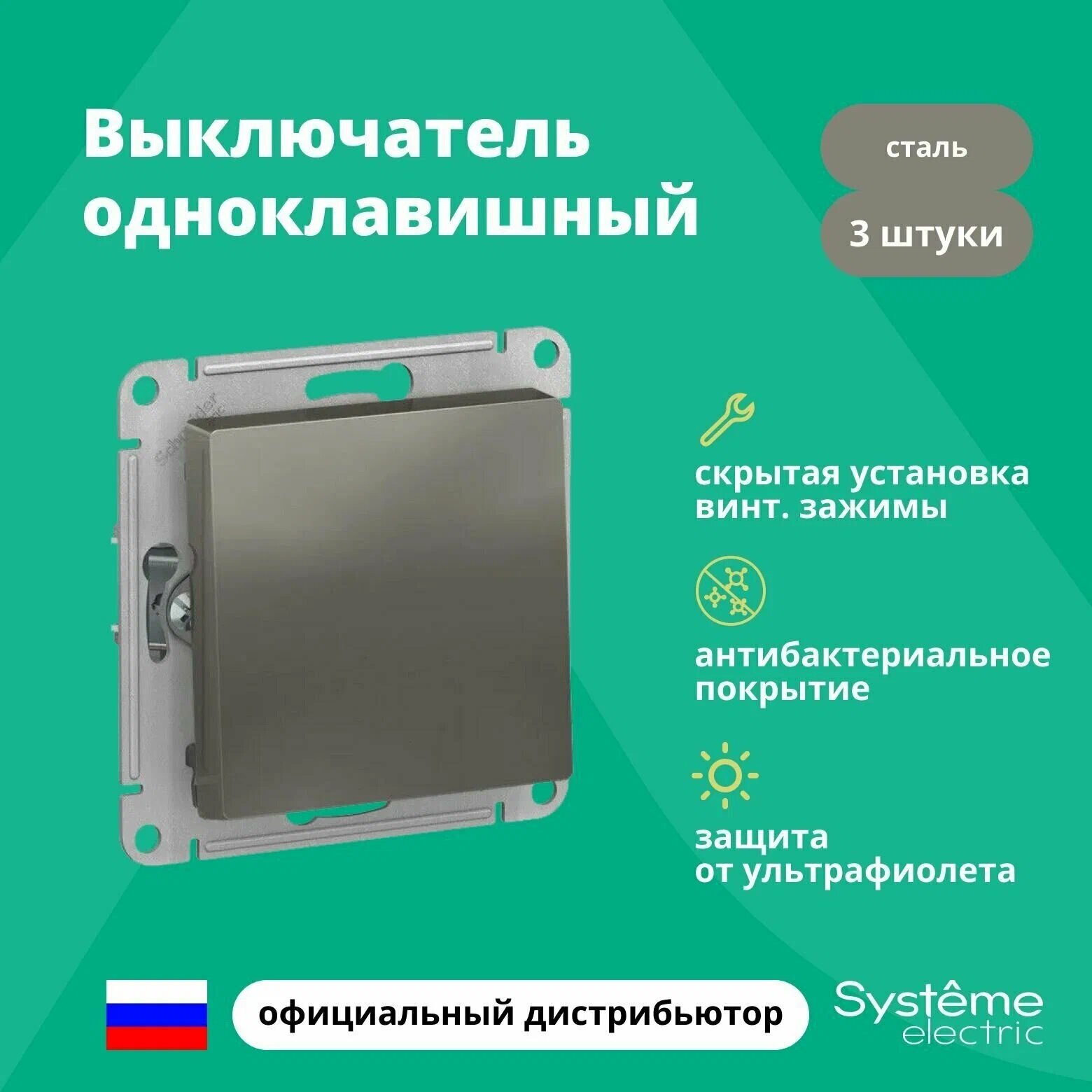 Купить Выключатель Systeme Electric Atlas Design 1-клавишный, ATN000911 Сталь - 3 шт.