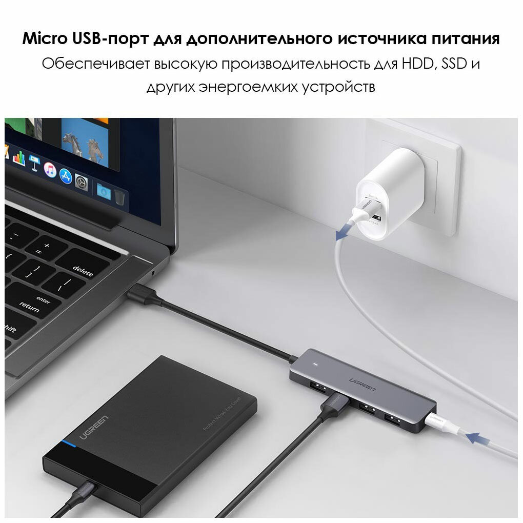 Разветвитель UGREEN USB 3.0 to 4-Port USB 3.0 Hub + Powered by Micro USB, Metal Plated Shell, Ultra Slim CM219 (50985)