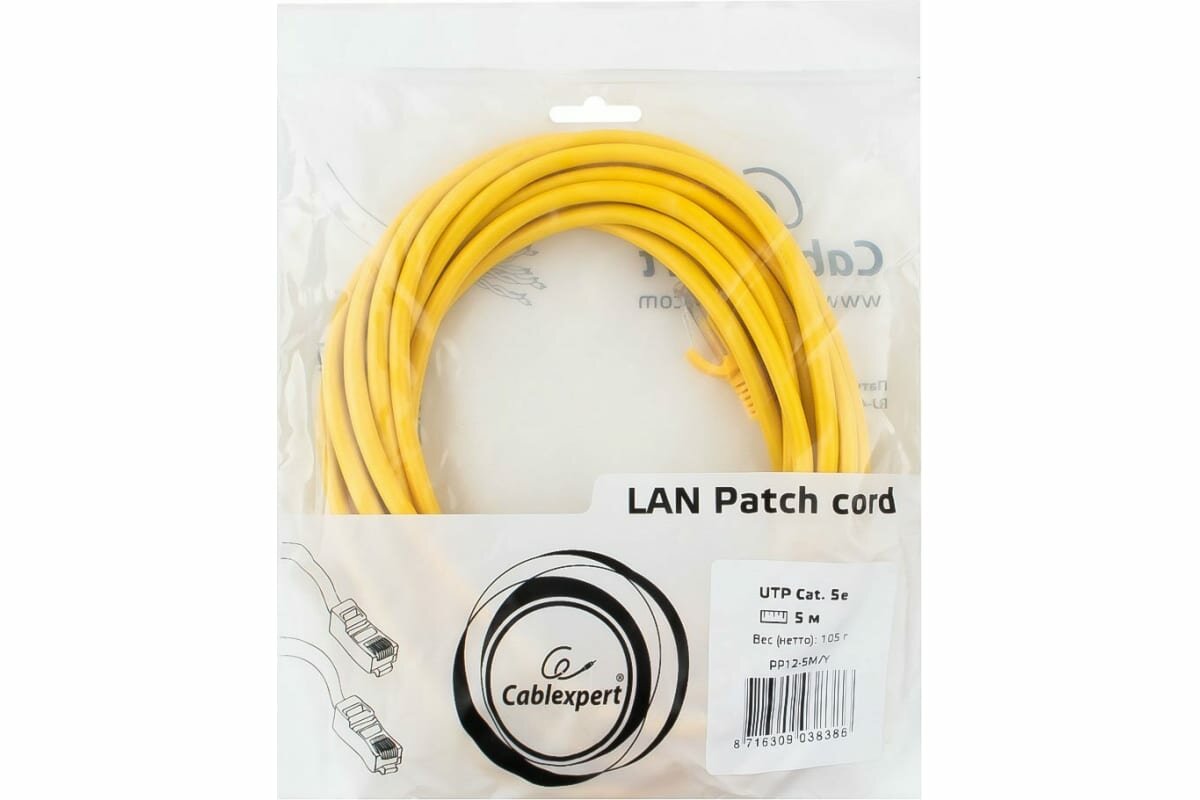 Патч-корд UTP Cablexpert PP12-5M/Y категория 5e, 5 м, литой, многожильный, желтый