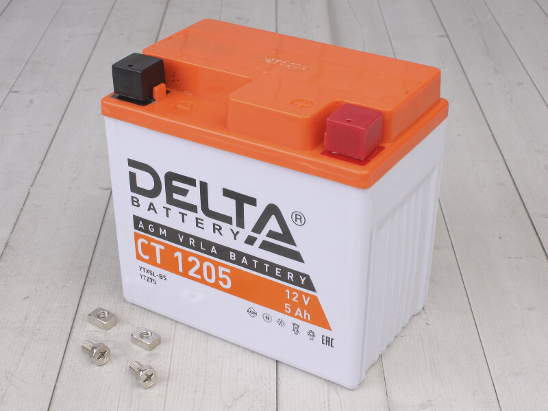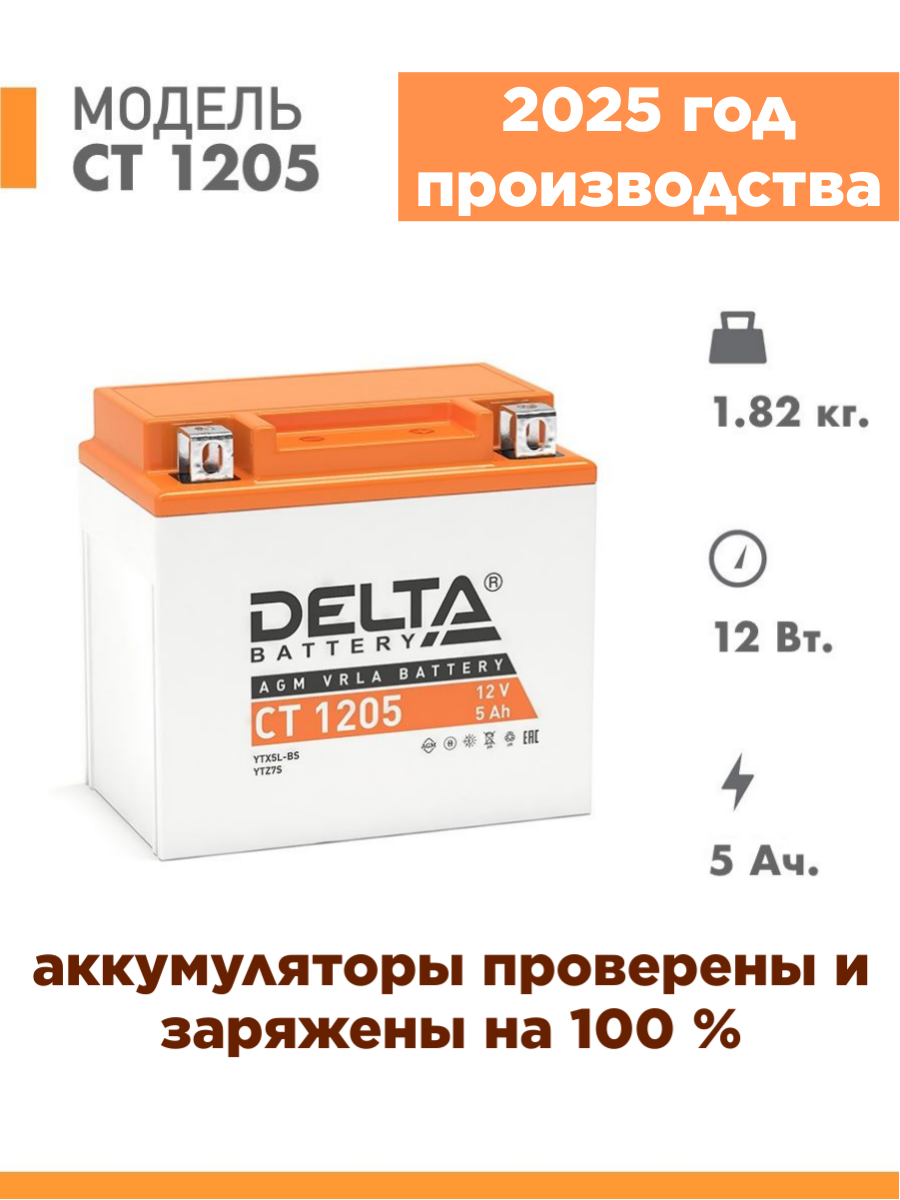 Аккумулятор для мотоцикла и скутера Delta CT1205 12V 5 А/ч 80 А обр. пол. залит/заряжен YTX5L-BS, YT5L-BS (114х69х109) AGM VRLA