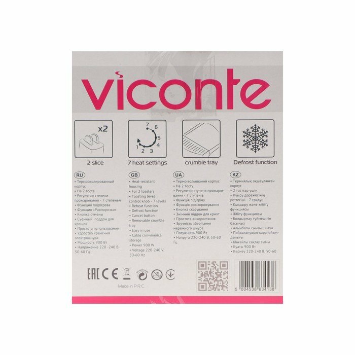 Тостер Viconte VC-413, 900 Вт, 900 Вт, 7 режимов прожарки, 2 тоста, чёрный