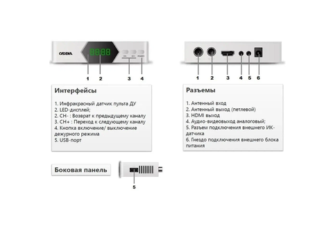 | Комплектация | Цифровая приставка. Пульт ДУ. Блок питания. Руководство пользователя. Кабель RCA. Элемент питания. |
