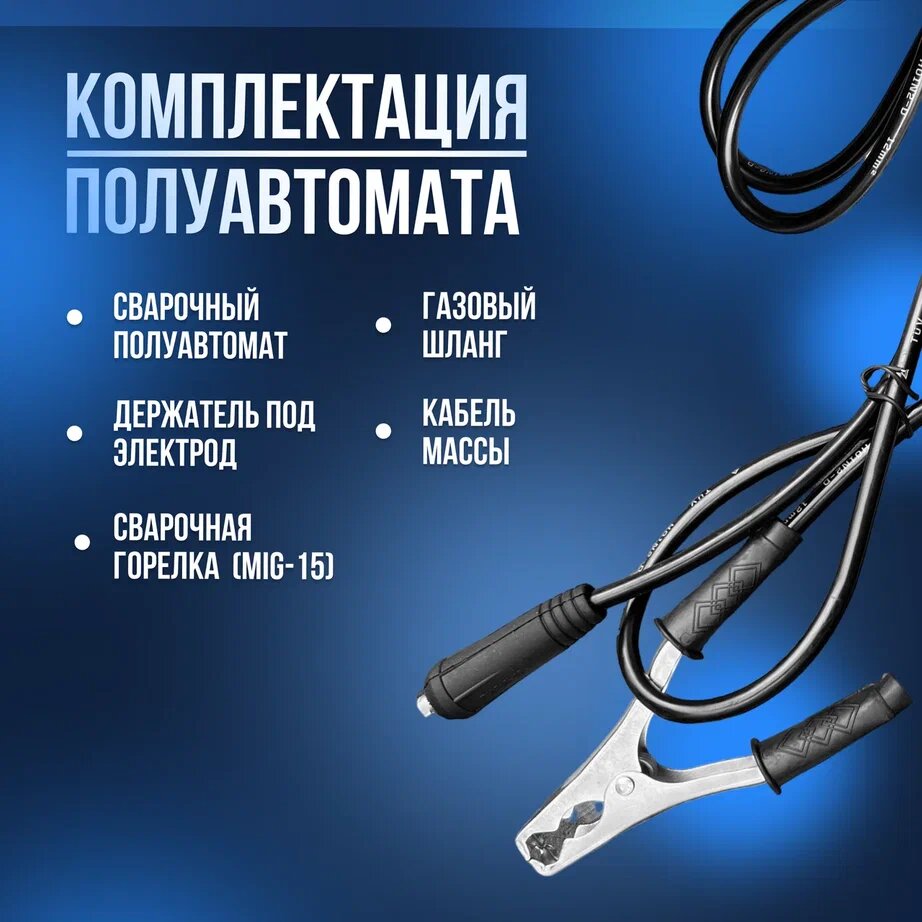| Комплектация | Комплектация: - Сварочный аппарат - 1шт. - Горелка в сборе (MIG-15) длина 3 м. - 1шт. - Кабель-масса с зажимом и силовым разъемом СКР в сборе, длина 2 м. - 1шт. - Держатель с кабелем и силовым разъемом в сборе, длина 3 м. - 1шт. - Щетка-молоток - 1шт. - Руководство по эксплуатации - Упаковка. |