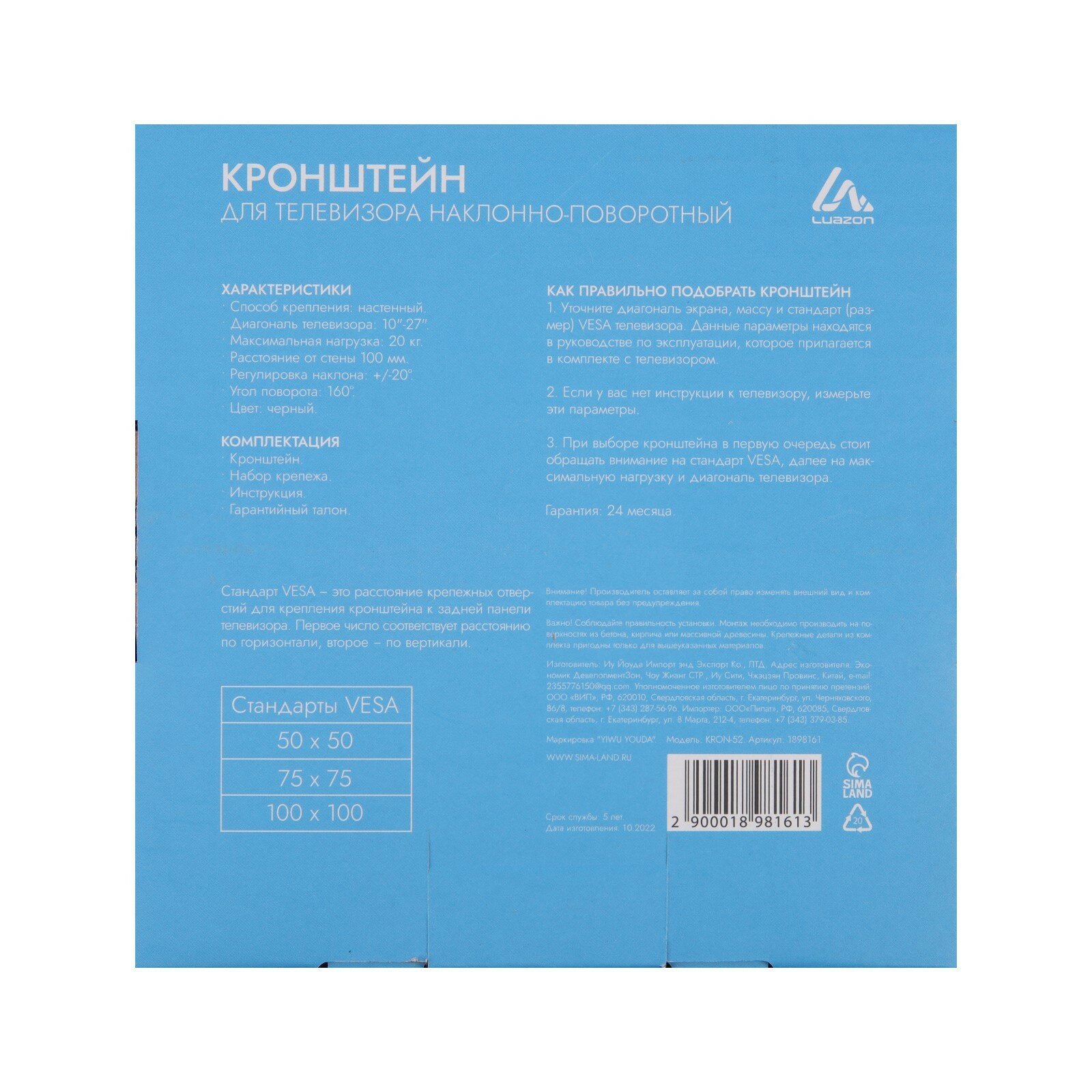 Кронштейн Luazon KrON-52, для ТВ, наклонно-поворотный, 10-27", до 20 кг, черный 1898161 интересное: