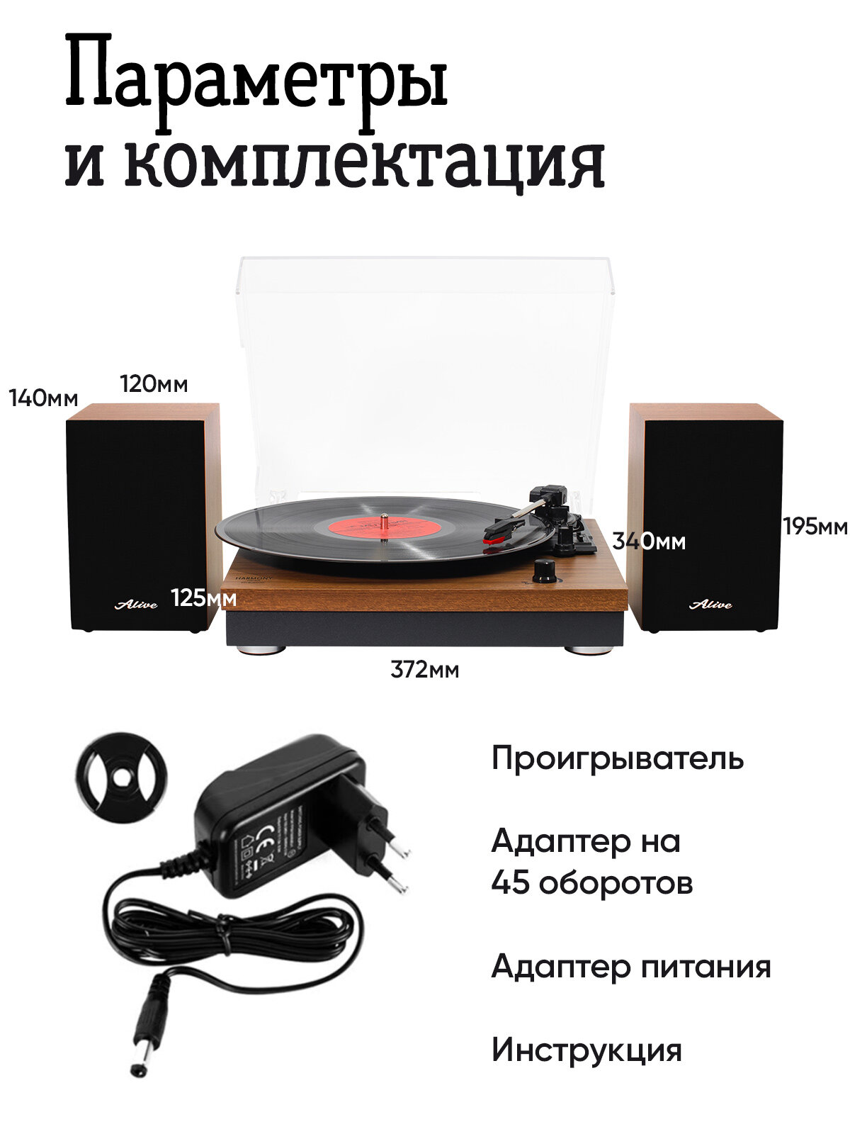 | Комплектация | виниловый проигрыватель Alive Audio Harmony, адаптер на 45 оборотов, инструкция, адаптер питания |
