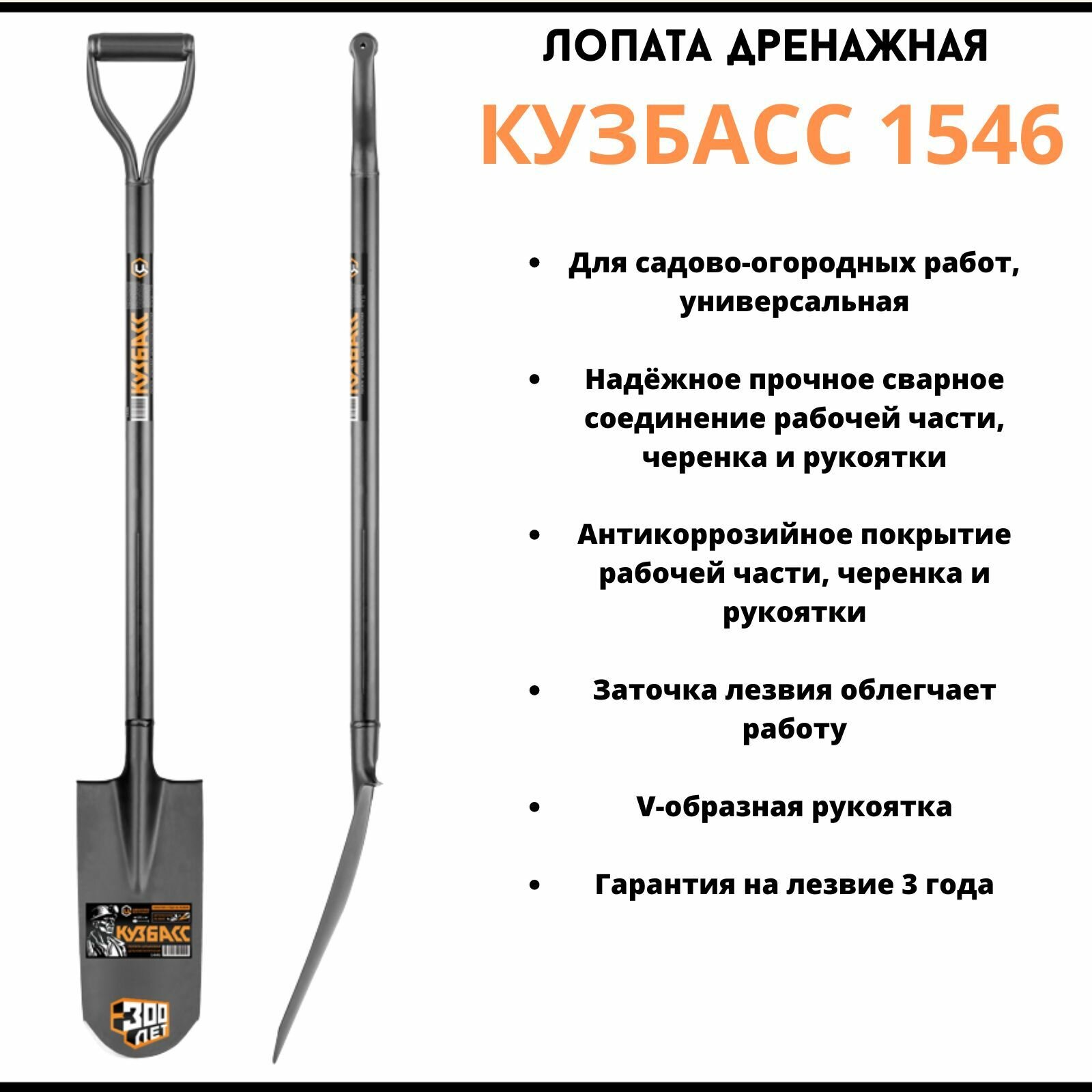 Лопата штыковая Кузбасс, дренажная,цельнометаллическая,120см (1546) (ЦИ)
