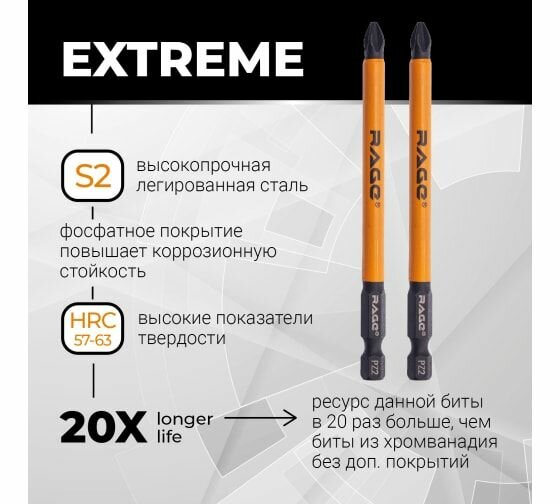 Биты магнитные S2 PZ2 x 100 мм 2 шт для шуруповерта RAGE by VIRA