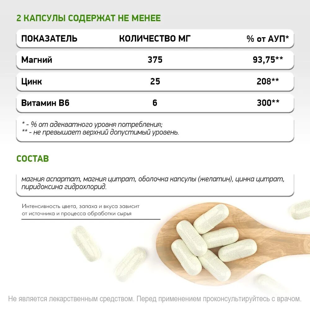 | Дополнительная информация | рекомендации по применению: взрослым по 1 капсуле 2 раза в день во время еды; состав: магния аспартат, магния цитрат, цинка цитрат, желатин, вода, пиридоксина гидрохлорид, краситель Е171 |