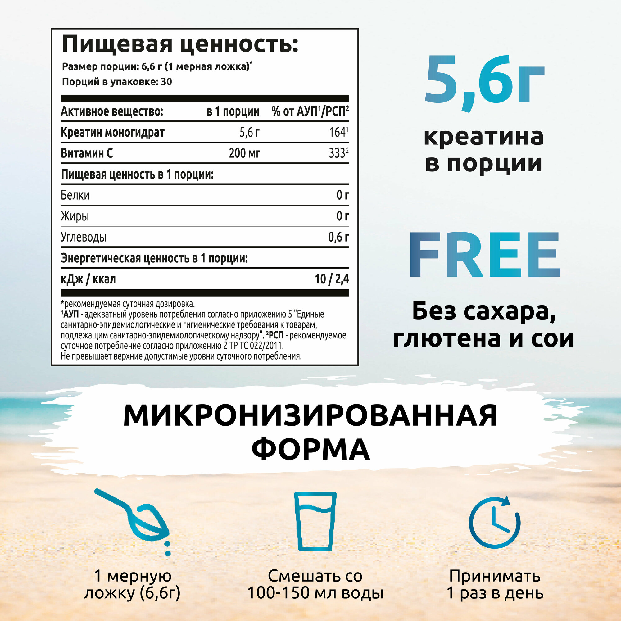 Креатин моногидрат порошок 30 порций, вкус Нейтральный, 200 гр спортивное питание