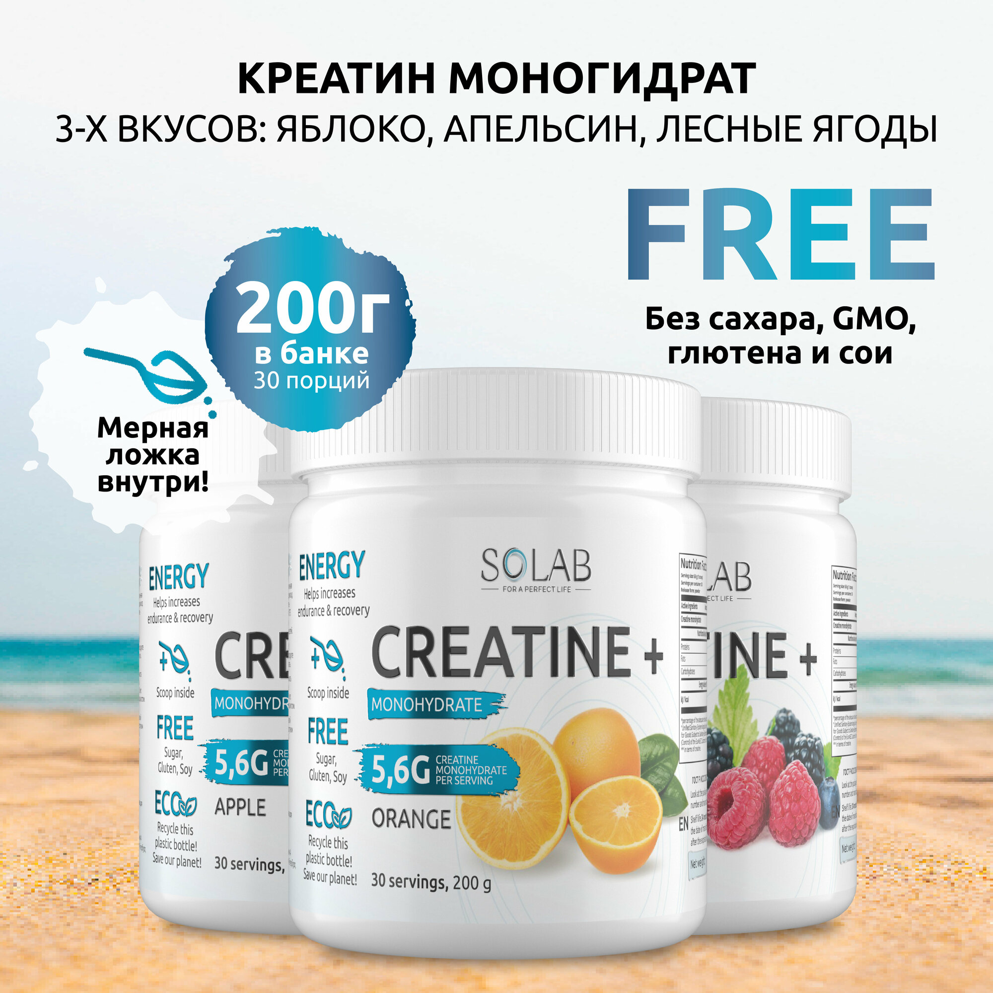 SOLAB Креатин моногидрат порошок 30 порций, Creatine Monohydrate, вкус яблоко, 200 гр спортивное питание