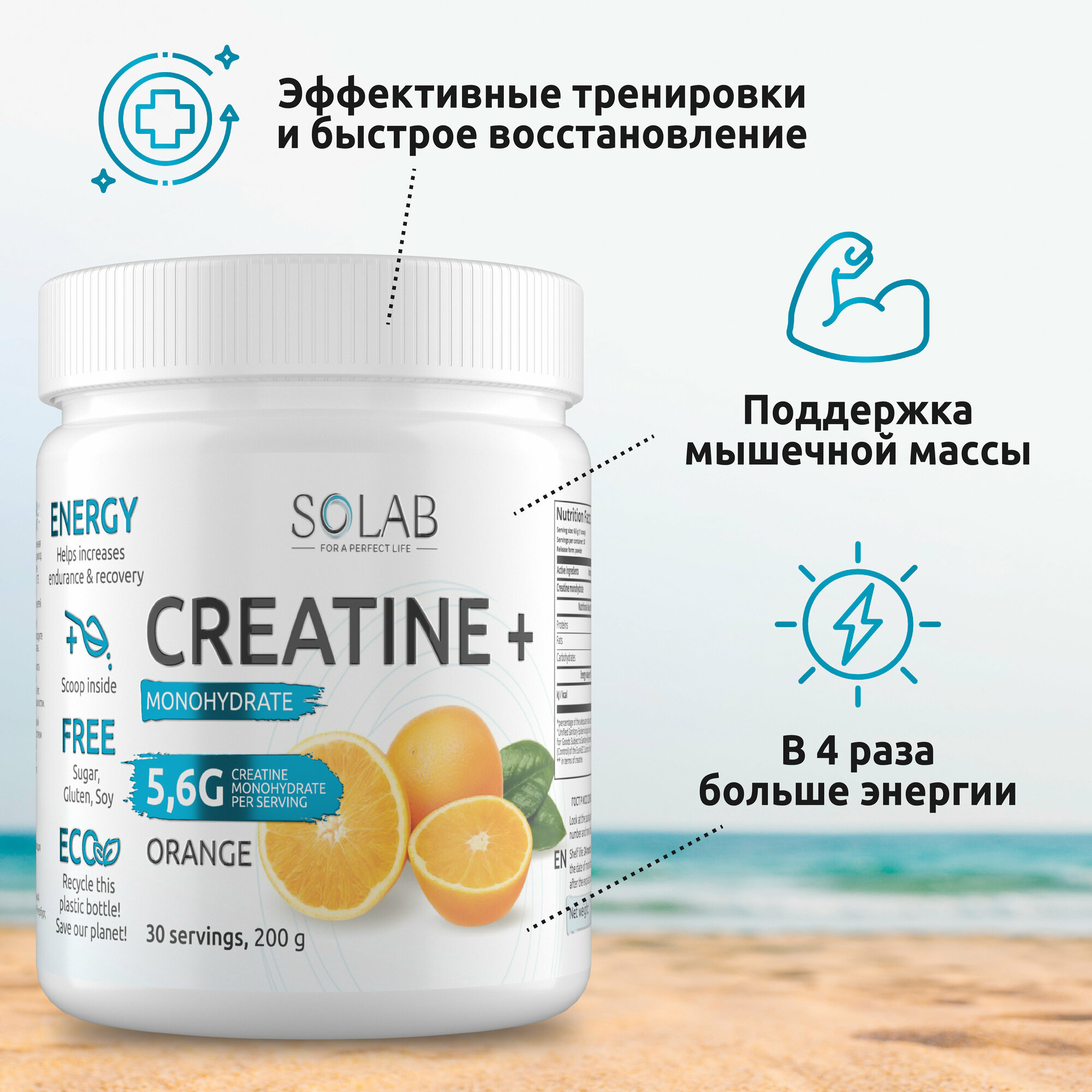 SOLAB Креатин моногидрат порошок 30 порций, Creatine Monohydrate, вкус апельсин, 200 гр спортивное питание