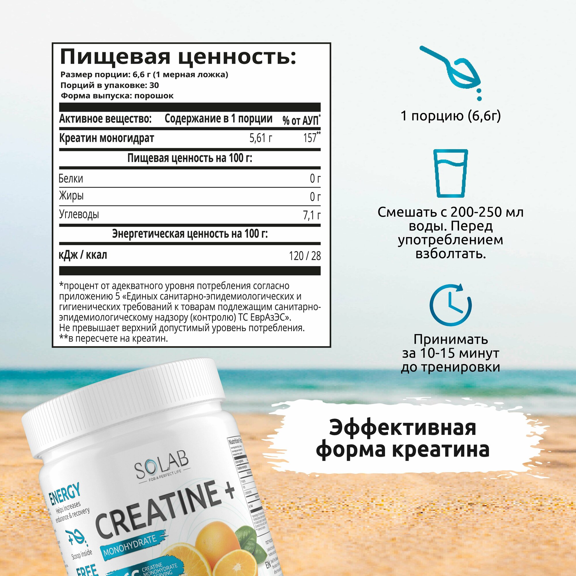 SOLAB Креатин моногидрат порошок 30 порций, Creatine Monohydrate, вкус Нейтральный, 200 гр спортивное питание