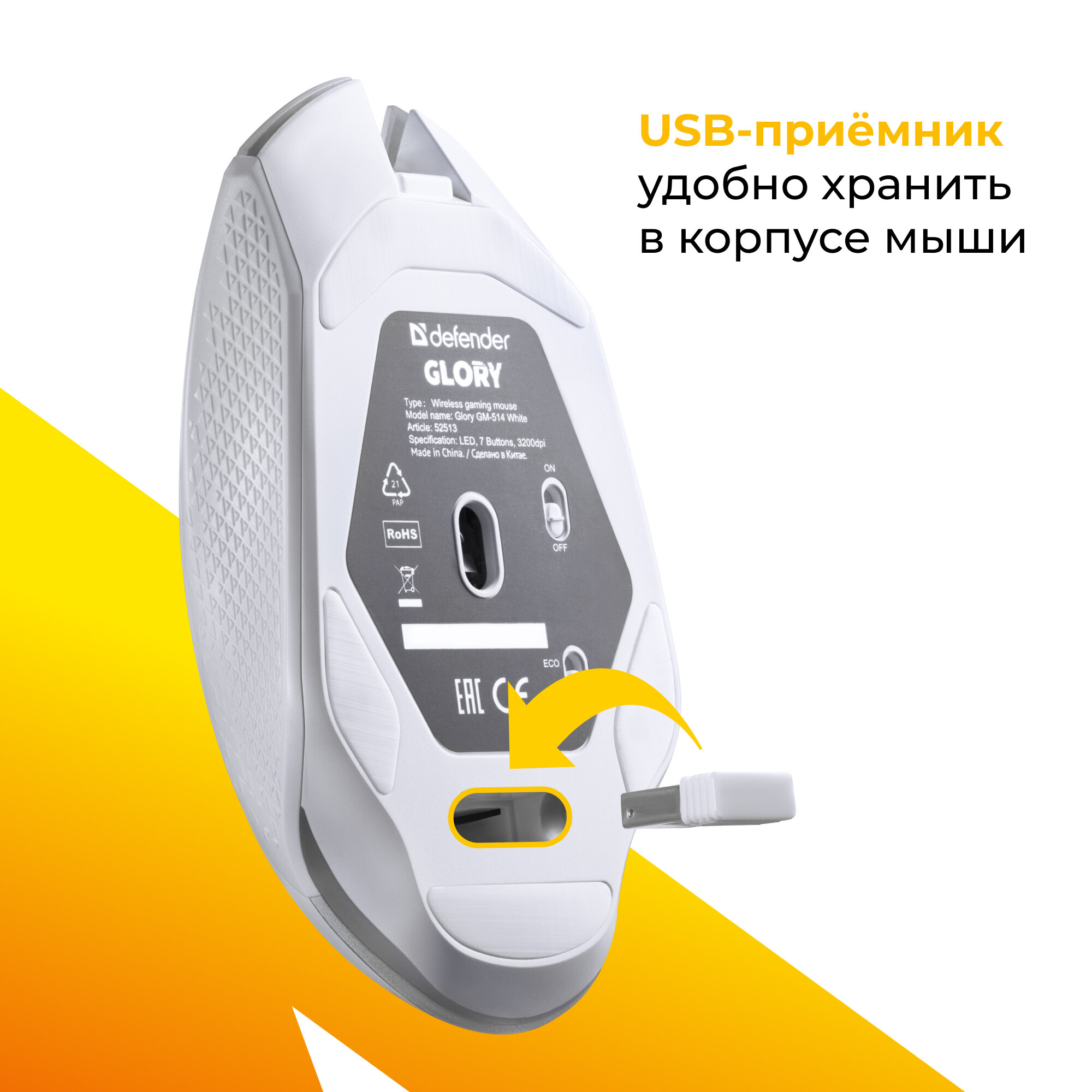 Мышь DEFENDER игровая беспроводная Glory GM-514 белый,LED,7D,400 мАч,3200dpi АКБ (52513)