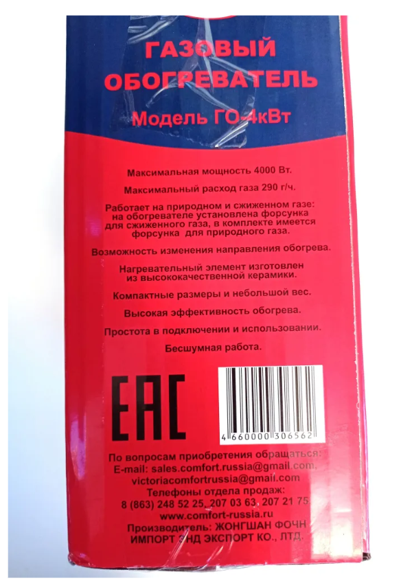 | Дополнительная информация | в комплекте форсунка для природного газа, винты для крепления газового штуцера, руководство по эксплуатации, гарантийный талон; природный газ; пропан; механическое управление; средний расход топлива 0.29 кг/ч; керамический нагревательный элемент; регулируемая опорная ножка; металлический корпус |