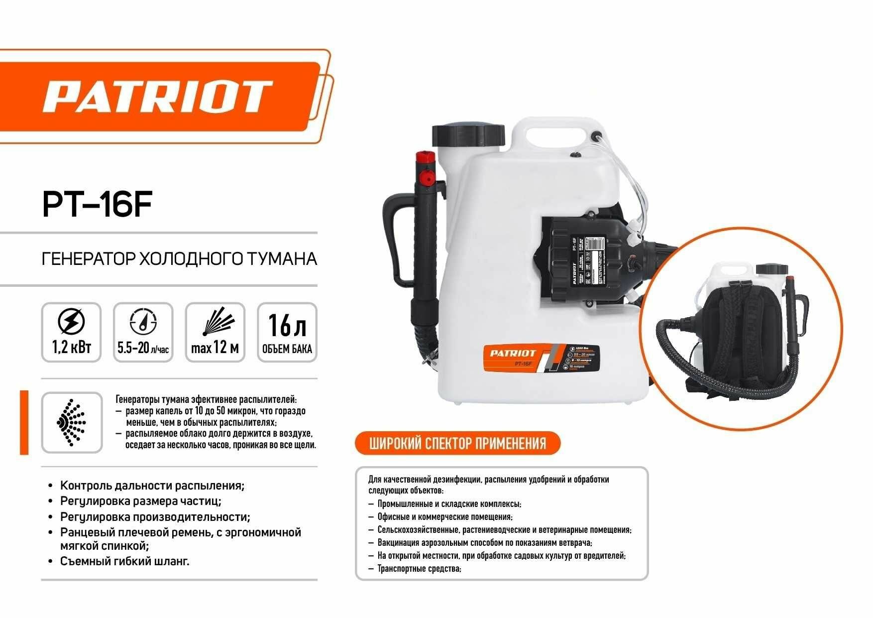 Генератор холодного тумана Patriot PT-16F электр. ранц. 16л белый (755302603) интересное: