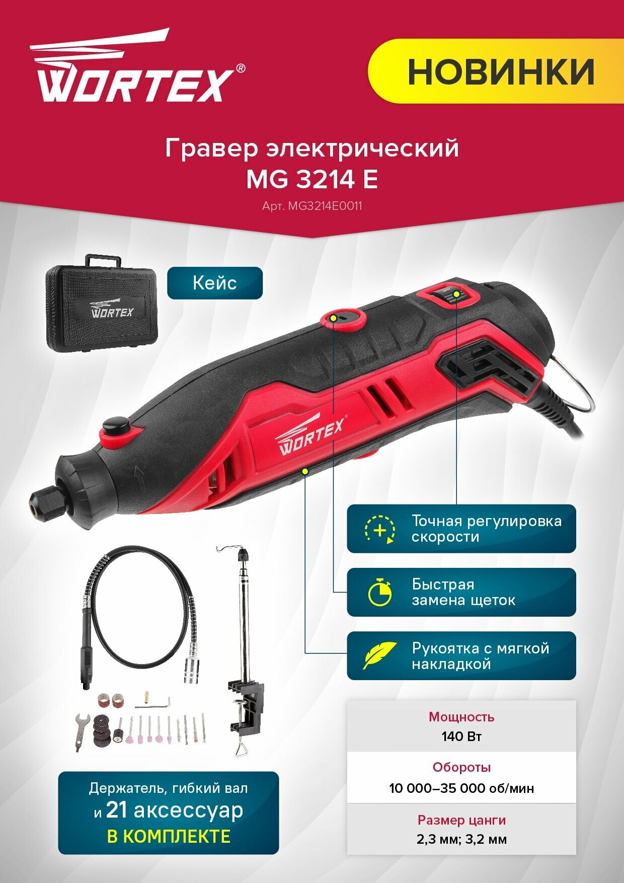 Гравер электрический WORTEX MG 3214 E в чем. + аксессуары (140 Вт, 10000 - 35000 об/мин, цанга 2.3 и 3.2 мм, чем. +21 аксесс, гибкий вал, держатель)
