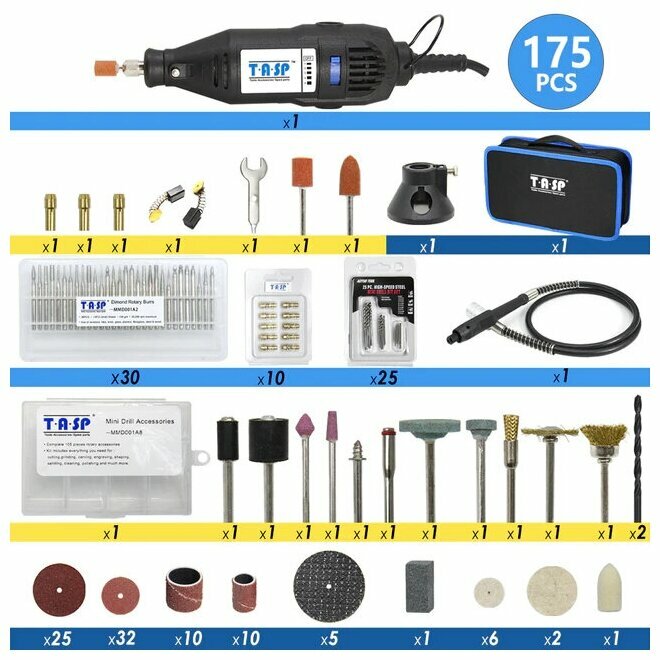 Купить Гравер TASP с гибким валом и набором бит насадок (175 элементов), с чехлом сумкой, для шлифования, полировки, резки, гравировки, сверления.