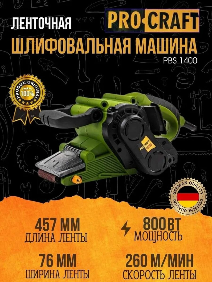 Ленточная шлифовальная машина Procraft PBS1400, лента 457х76мм, 260м/мин, 800 Вт, протяжка 120-260 м/мин