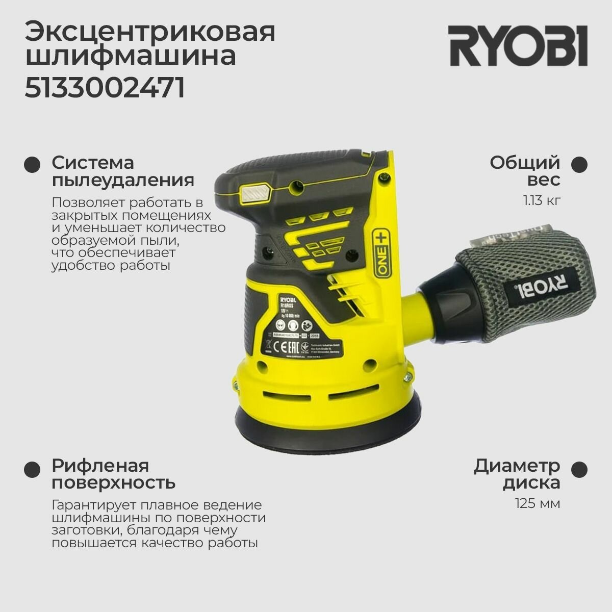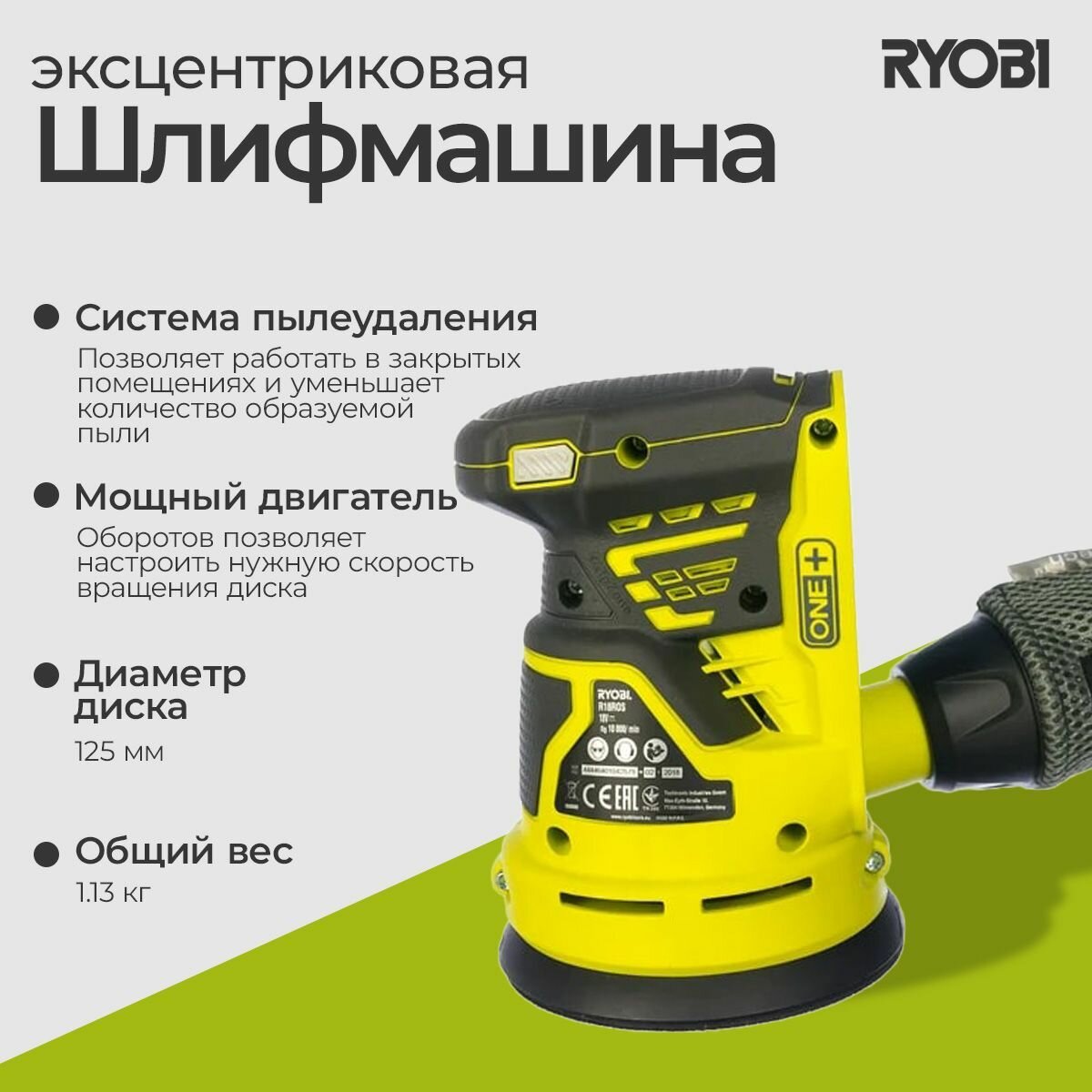 Ryobi ONE+ Эксцентриковая шлифмашина R18ROS-0 без аккумулятора в комплекте 5133002471