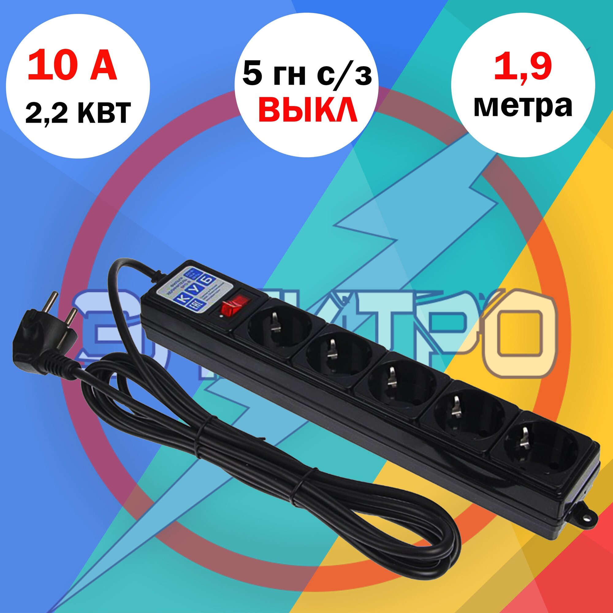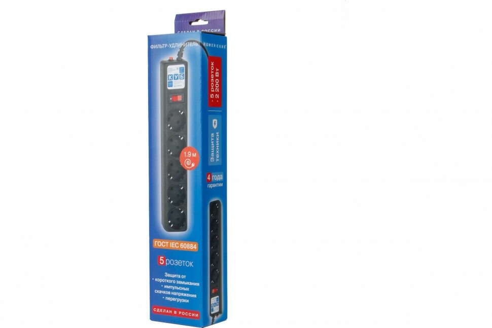 Сетевой фильтр 5 гн, 1.9 м, с/з, 10 А, 2.2 кВт, чер, Power Cube