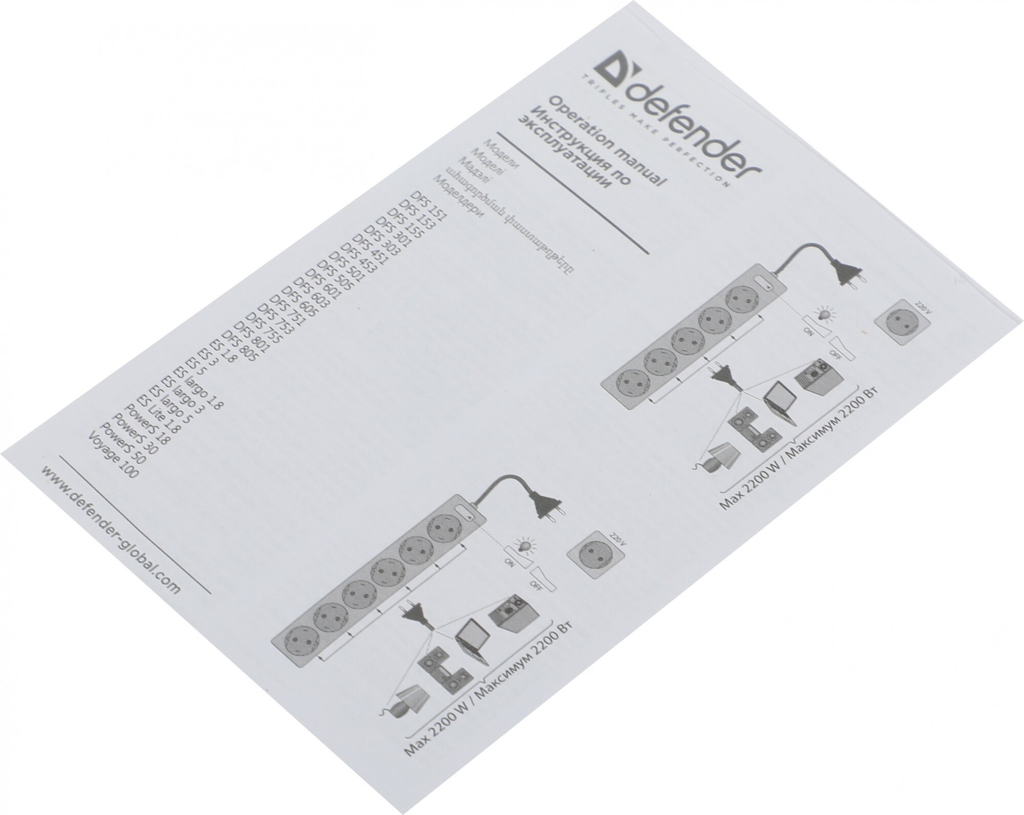 Сетевой фильтр Defender DFS 151, 2200Вт, IP20, длина кабеля 1.8м