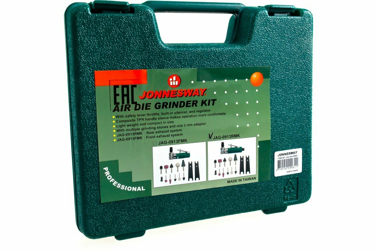 JAG-0913RMK Набор бормашинка пневматическая угловая Jonnesway 18000 об/мин., патрон 3/6 мм, L-155 мм с насадками, 15 предметов