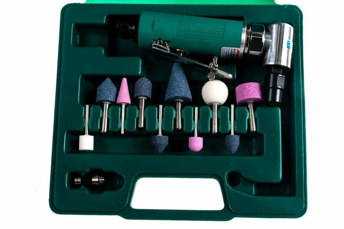 JONNESWAY JAG-0913RMK Набор бормашинка пневматическая угловая 18000 об/мин., патрон 3/6 мм, L-155 мм с насадками, 15 предметов