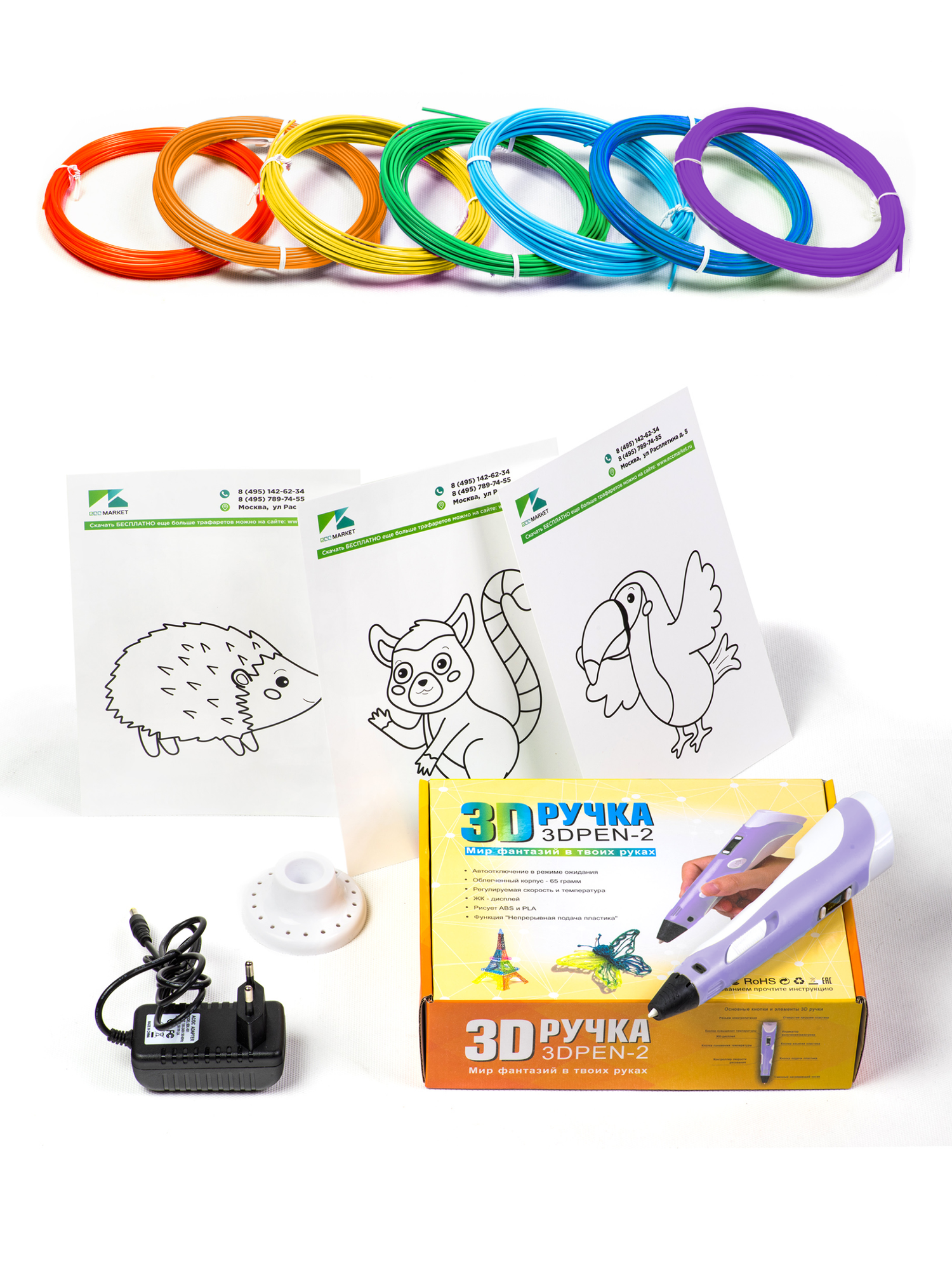 3D ручка ECC Market 3D Pen 2 с набором дополнительного пластика "радуга" и трафаретами фиолетовый