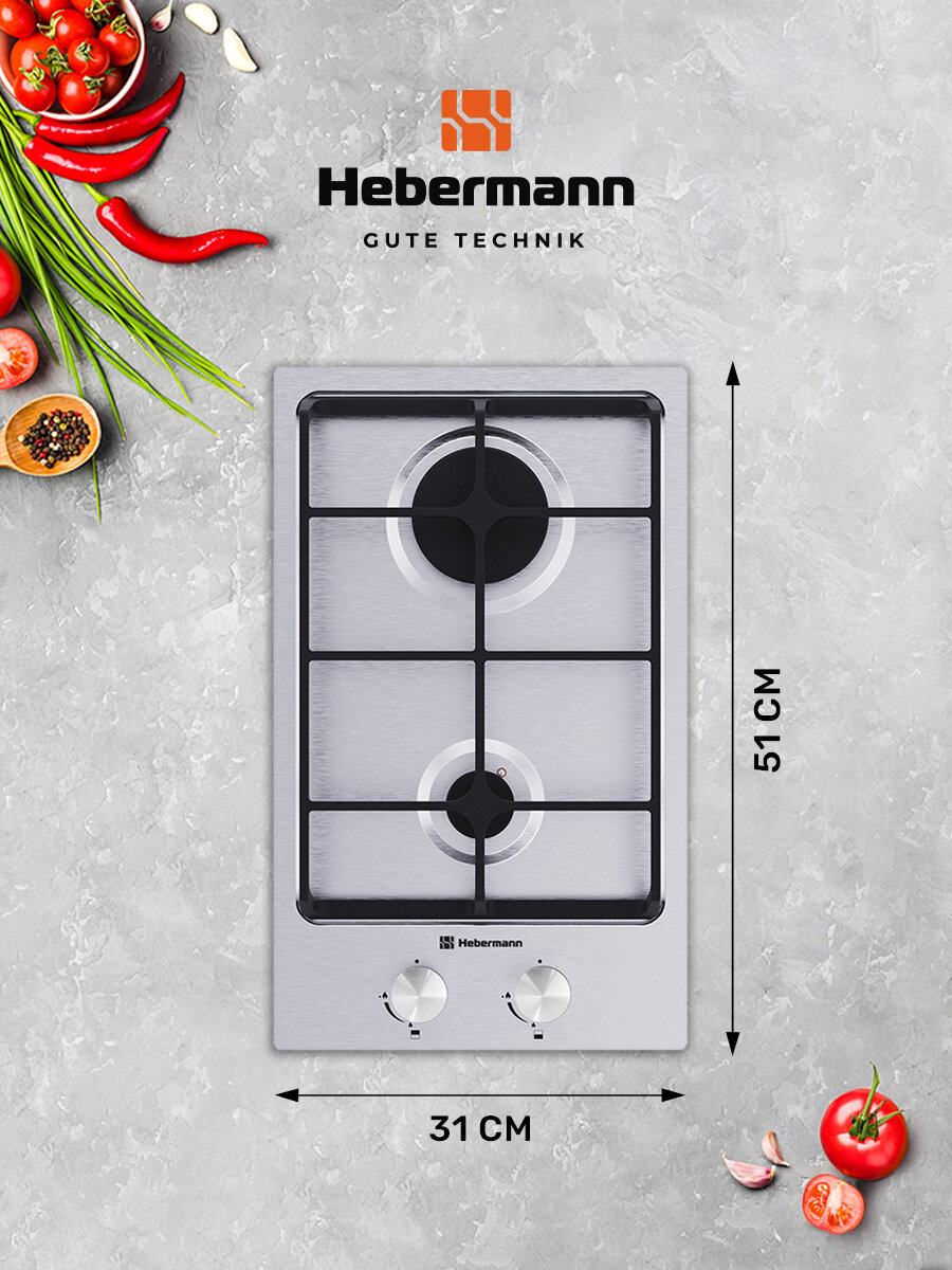 Газовая варочная панель Hebermann HBGS 302.1 X, ширина 31 см, нержавеющая сталь, 2 конфорки