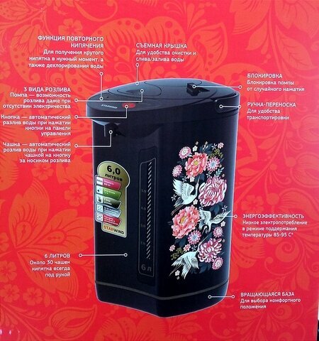 | Плюсы: | Отличный термопот за свои деньги. Для объема 6 л не сильно массивный. |