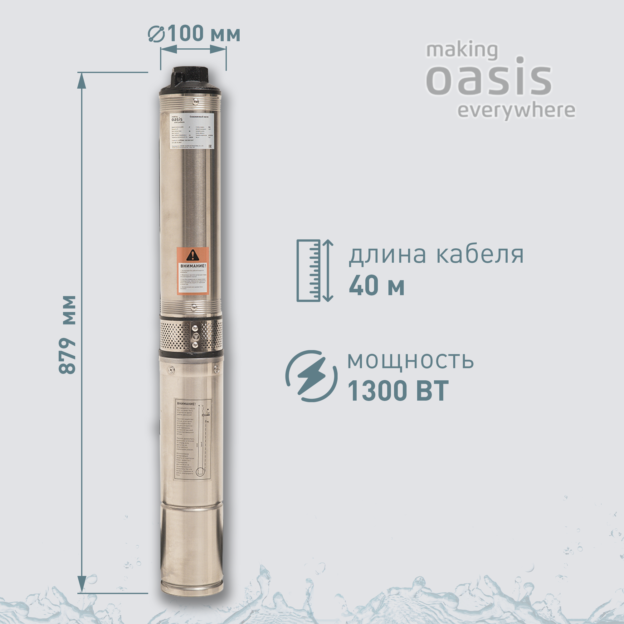 Насос скважин, Oasis, ниж забор, 40 м, 750 Вт, d100 мм, погруж70 м, напор75 м, 5.1 м³/ч, 85/75
