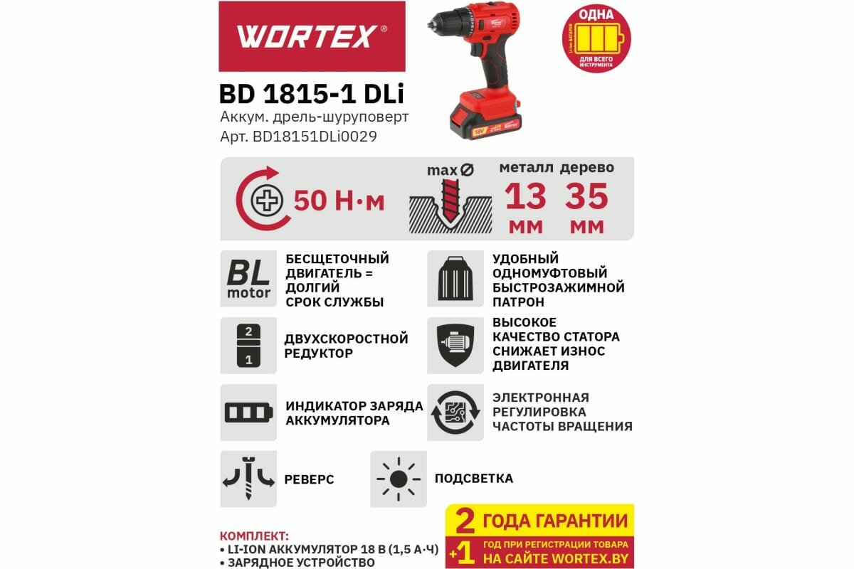 Аккум. дрель-шуруповерт WORTEX BD 1815-1 DLi в кор. (18.0 В, бесщёточный, 1 акк., 1.5 А/ч Li-Ion, 2 скор., 50 Нм, шурупы до 9 мм) (BD18151DLi0029)