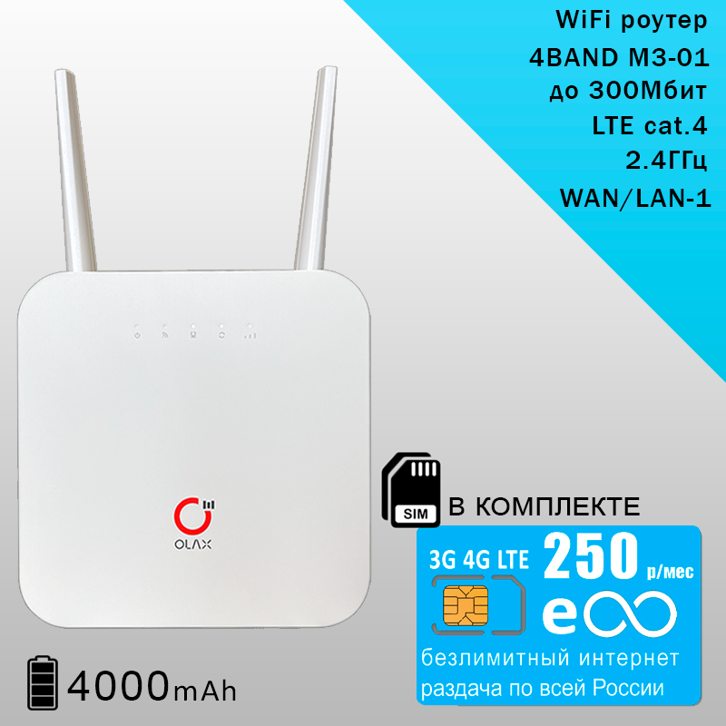 Комплект с безлимитным интернетом и раздачей за 250р/мес, роутер OLAX AX6 PRO со встроенным 3G/4G модемом + сим карта
