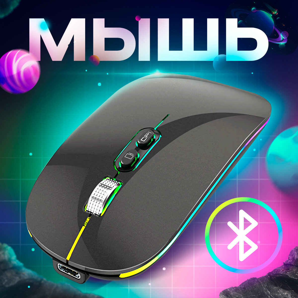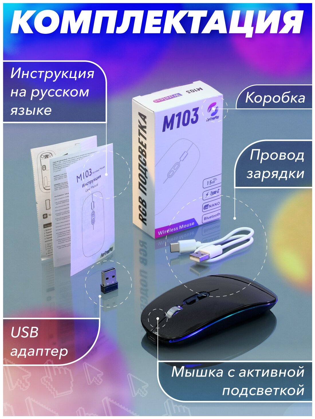 Мышь беспроводная М103, Bluetooth 5.1 + Nano USB, Зарядка Type-C Компьютерная мышка с RGB подсветкой, бесшумная мышка с Аккумулятором
