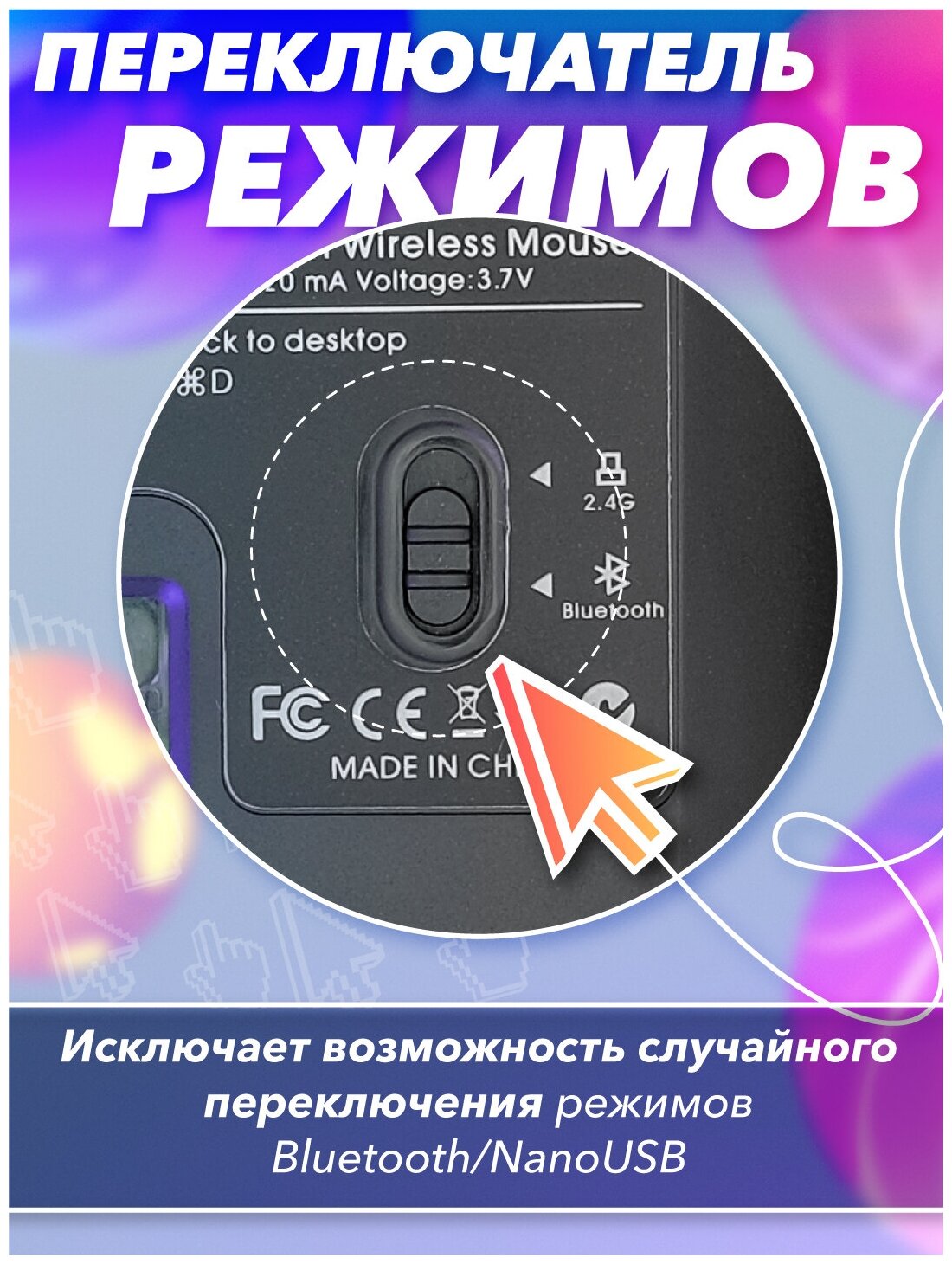 | Плюсы: | Цена. Беспроводная мышка за такие деньги. Bluetooth + 2.4g. |