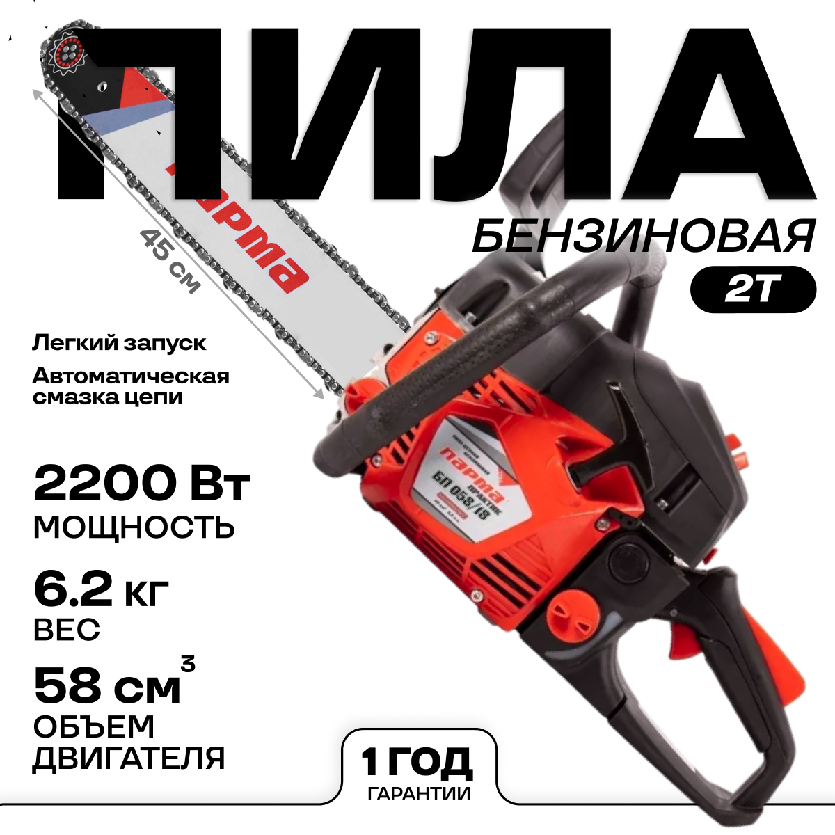 Бензопила "парма" БП 058/18, 2Т, 2.2 кВт, 3 л.с., 18", шаг 0.325", 72 зв.
