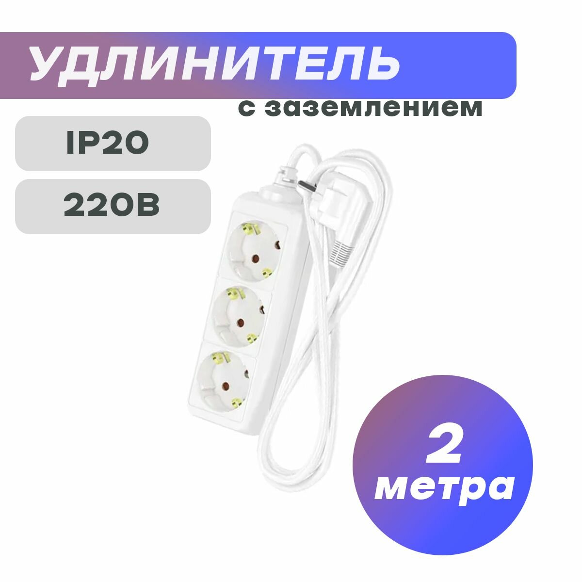 Удлинитель для гирлянды сетевой для розетки фотон 16А 2м 3 розетки с заземлением белый, ГОСТ