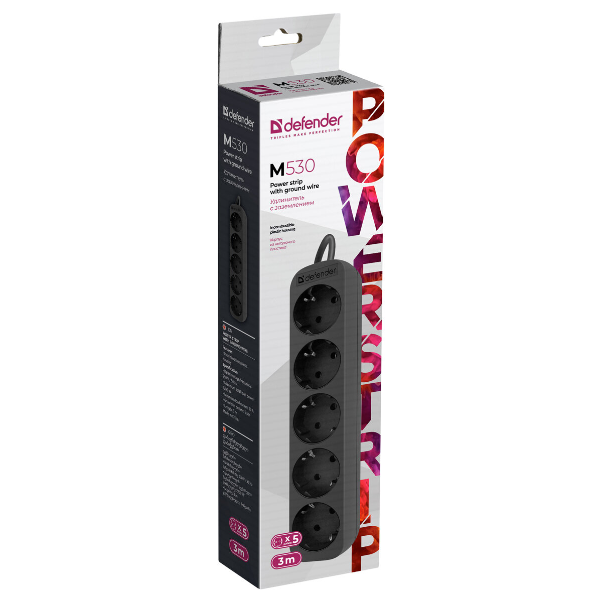 Удлинитель Defender M530, 5 розеток, с заземлением, 3м, черный (арт. 367823)