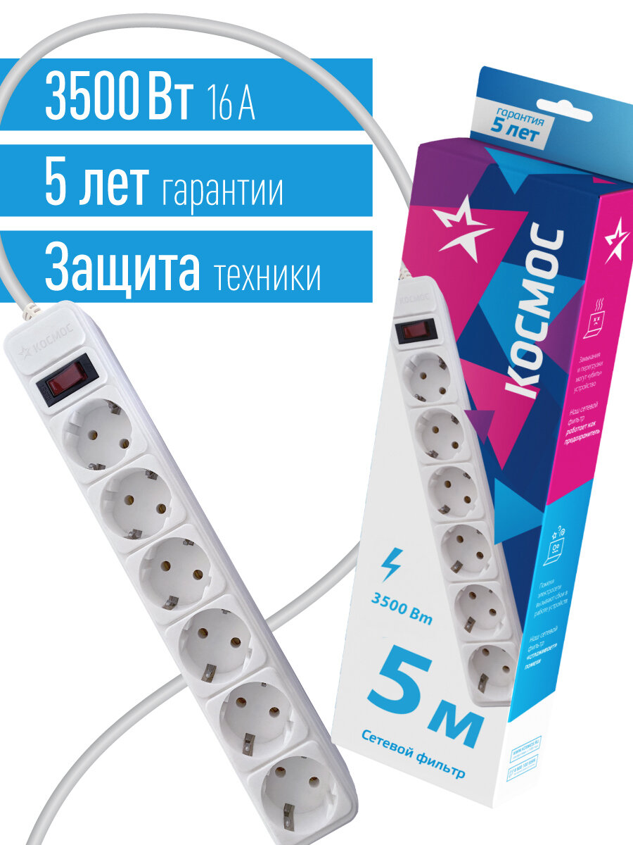 Сетевой фильтр Космос 6 розеток, 5 м, пвс 3х0,75мм2, белый